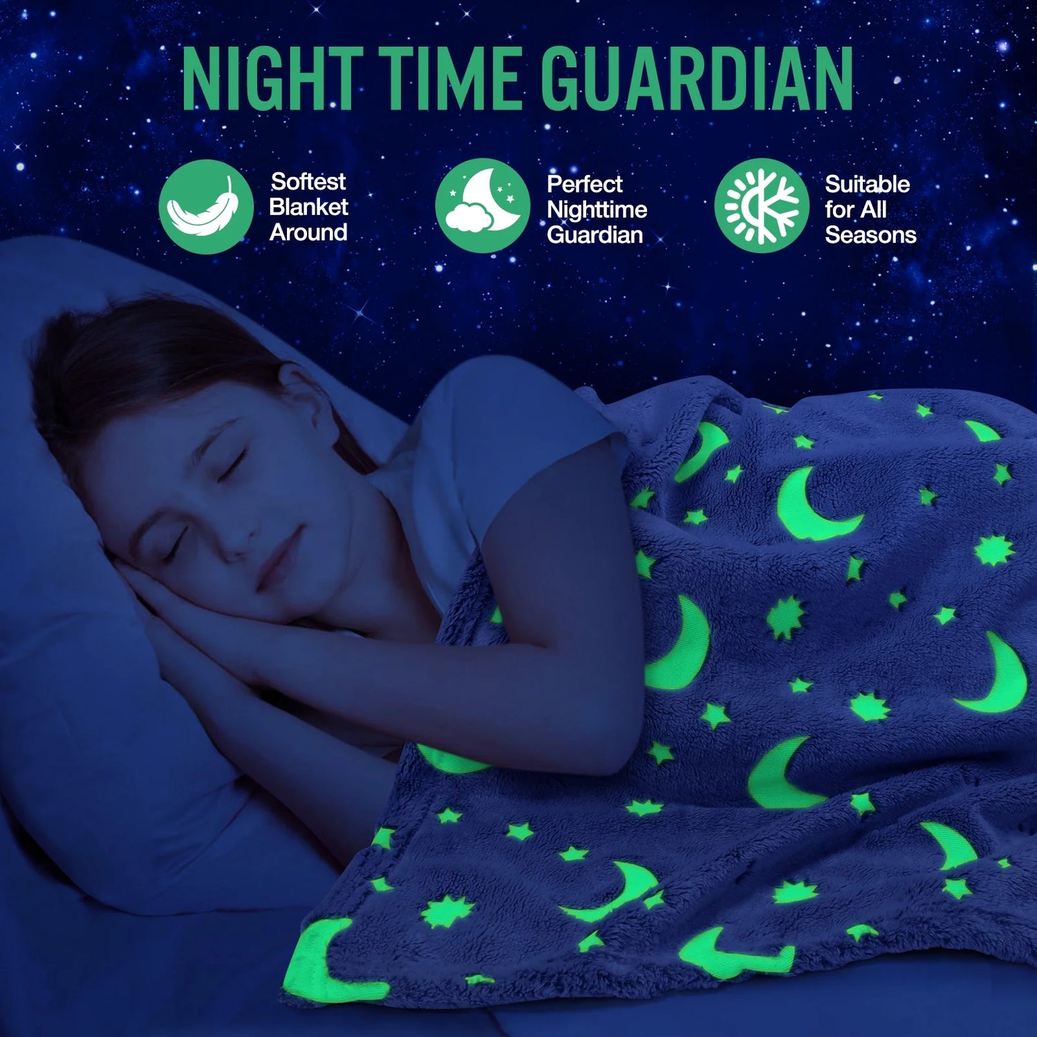 Ukoliko se Vaše dete boji mraka uveče kada se ugase svetla, ova ćebad su izuzetno dobro rešenje zato što svetle u mraku i tako opuštaju dete i smanjuju strah od mraka.(Jednostavno ga izložite pod jakim izvorom svetlosti ili sunčevom svetlošću 10-15 minuta da apsorbuje svetlost)